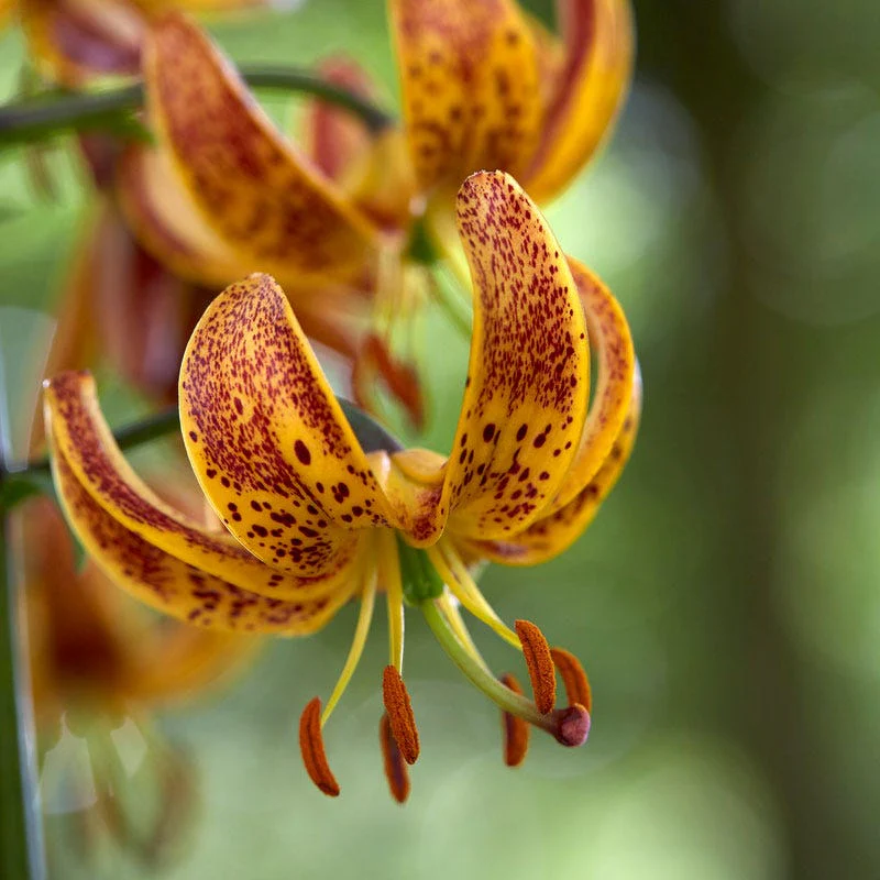 36" tall (2-3 feet), Martagon Lily Sunny Morning features striking recurved petals in golden-orange speckled with burgundy spots. The recurved, downward-facing petals create a unique display, perfect for borders, walkways and containers. This Lily loves any sunny spot and blooms in early to mid-summer. Sunny Morning prefers moist but well-drained soil. Returning year after year, this lily attracts butterflies in spades and is beautiful when cut for arrangements..
